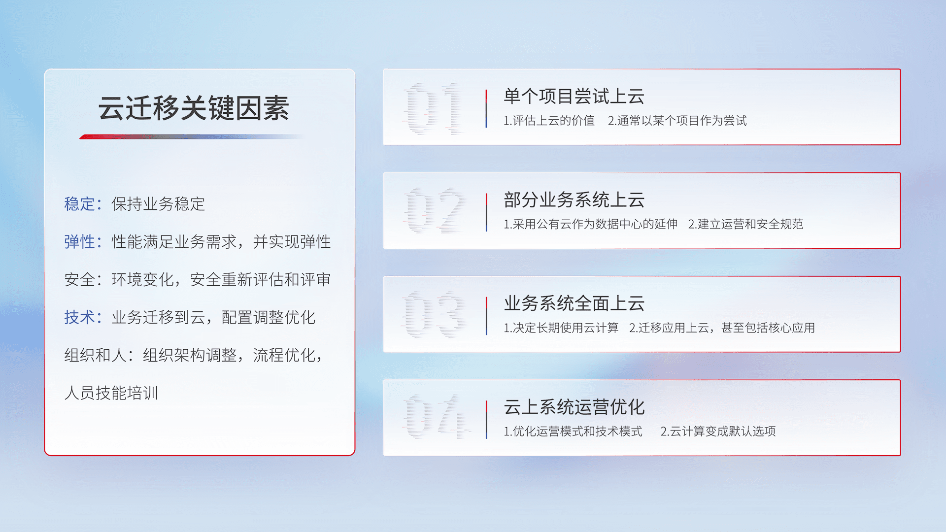 结合实际业务,,,,从规划设计、、、、云平台选型、、、云原生改造、、、、数据迁移、、集成交付,,迁移全过程为客户识别最佳上云路径,,做好风险识别管理,,,设计网络架构、、身份权限、、、安全审计合规、、、操作审计、、日志审计、、监控告警策略、、多站点容灾设计等,,,,对云上基础设施进行整体规划,,,提升IT治理水平,,,以满足弹性、、、、高可用、、、、高性能的需求。。
