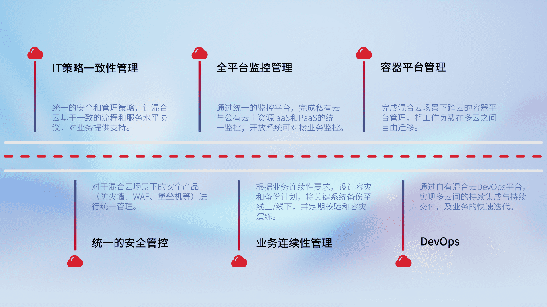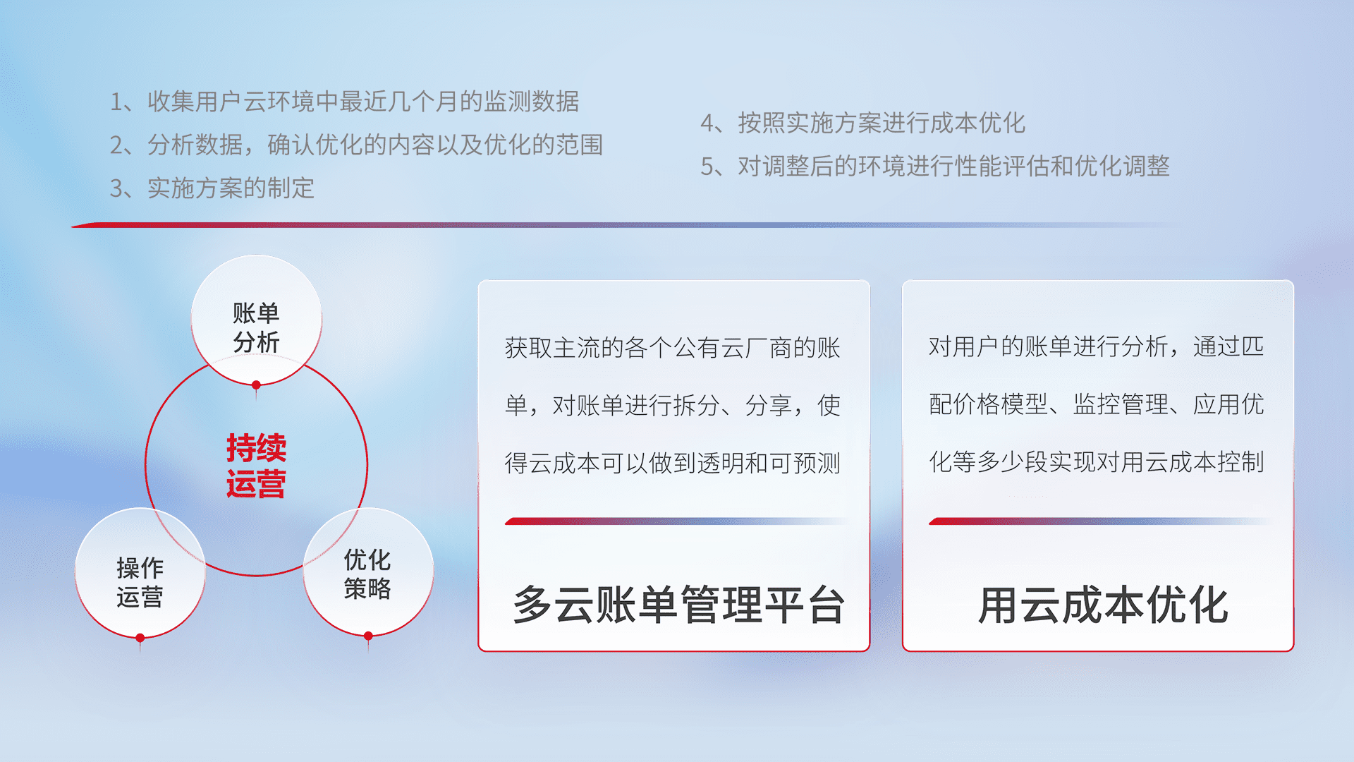 通过多云纳管,,,,以统一的资源数据模型把客户的云资源进行抽象和封装,,进而实现对多云资源的统一操作,,,保障云资源管理的可靠性、、稳定性与可用性。。。量身定制化运维内容,,,,配置、、、、开发运维、、补丁管理、、备份、、、、监控、、、认证和访问管理、、、、审计和日常巡检等,,保障在用云过程中的可靠度,,,稳定度以及高可用率。。。。